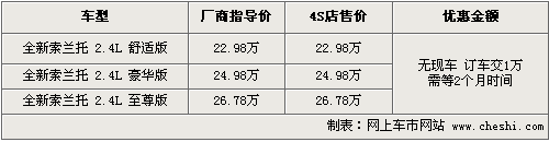 目前筆者了解到,全新索蘭托首批有黑色現(xiàn)車到店,但很快被選購一空。目前的銷售非;鸨瑩(jù)銷售人員介紹,訂單已經(jīng)超過了200臺,現(xiàn)在購車雖然不再加錢,但是需要等2個(gè)月時(shí)間,訂金為1萬元,11月份才能正式交付使用。