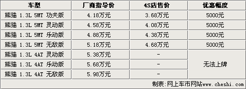 據(jù)吉利汽車(chē)4S店銷(xiāo)售人員介紹,熊貓1.3L手動(dòng)擋車(chē)型目前都有現(xiàn)車(chē)銷(xiāo)售,而自動(dòng)擋雖然已經(jīng)上市,但由于北京地區(qū)無(wú)法上牌,所以還沒(méi)有現(xiàn)車(chē)抵達(dá)北京市場(chǎng),預(yù)計(jì)最早會(huì)在今年年底前解決無(wú)法上牌的問(wèn)題。目前熊貓1.3L手動(dòng)擋全系可以優(yōu)惠五千元,而這款車(chē)型還增加了電動(dòng)升級(jí)后窗,需要在原價(jià)的基礎(chǔ)上加1000元。