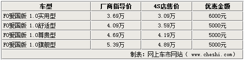 據(jù)比亞迪汽車4S店銷售人員介紹,比亞迪F0愛國(guó)版igo系列車型的現(xiàn)車并不是很齊全,實(shí)用型和舒適型都有現(xiàn)車,尊貴型和旗艦型則需要預(yù)訂,大概10-15天即可提車。而目前1.0L實(shí)用型和舒適型都有現(xiàn)車,其中實(shí)用型可以優(yōu)惠6000元,優(yōu)惠后售價(jià)已經(jīng)接近3萬(wàn);而其他車型只可以優(yōu)惠5000元現(xiàn)金。