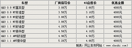 據(jù)奇瑞QQ3專營(yíng)店銷售人員介紹,奇瑞QQ3系列車型比較齊全,只有1.1AMT車型現(xiàn)車較少。但目前QQ3全系都有一定的優(yōu)惠幅度,除現(xiàn)車較少的車型需要提前預(yù)訂以外,全系車型均可以優(yōu)惠4000元。