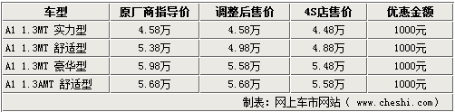 據(jù)奇瑞汽車4S店銷售人員介紹,奇瑞09款A(yù)1目前只有舒適型有現(xiàn)車銷售,原廠商指導(dǎo)價(jià)為5.38萬元,官方降價(jià)后為4.98萬元。A1 1.3L豪華型和新增加的實(shí)力型和自動(dòng)擋目前都沒有現(xiàn)車,預(yù)訂需要等1-2周才能提到現(xiàn)車。目前購買奇瑞A1全系車型,都可以贈(zèng)送一款價(jià)值3000元的GPS導(dǎo)航儀一部。