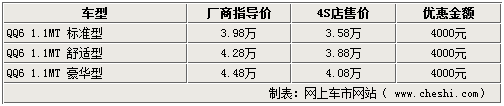 據(jù)奇瑞QQ6專營(yíng)店銷售人員介紹,奇瑞QQ6系列車型比較齊全,目前全系都有一定的優(yōu)惠幅度,除現(xiàn)車較少的車型需要提前預(yù)訂以外,全系車型均可以優(yōu)惠4000元。