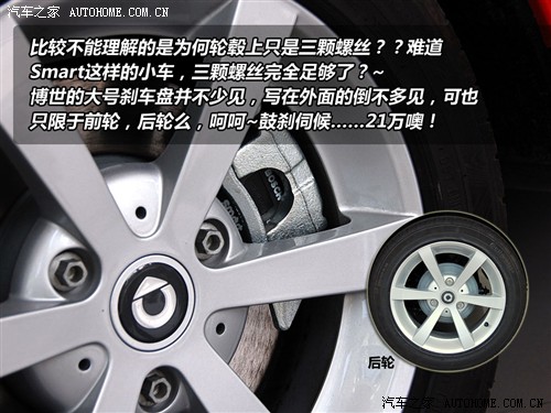 你注意到了嗎?smart的輪轂僅僅用三顆螺絲就固定在了軸承上,而一般我們見到的車至少需要4顆螺絲,看來這種車在國外真的是最低端的類型,但引進到國內(nèi),它的價格可不便宜,如果不是極端追求個性后者對smart情有獨鐘,還真不太好接受。