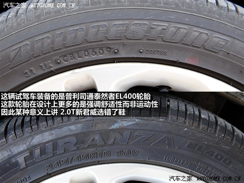 但使用了18寸的輪轂,新君威是不是就足夠運(yùn)動(dòng)了呢?輪胎的選擇是非常重要的因素,新君威錯(cuò)誤地選擇了一款普利司通的泰然者EL400型245/45 R18 96V輪胎,非常遺憾,這款輪胎的側(cè)重點(diǎn)是舒適性而非運(yùn)動(dòng)能力,抓地力不足,在2.4旗艦版上或許還不是大的問題,但對(duì)于2.0T發(fā)動(dòng)機(jī)則不能很好地發(fā)揮它的性能。