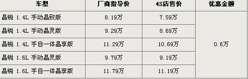 據(jù)4S店銷售人員介紹:目前晶銳全系優(yōu)惠6000元,最低僅售7.59萬。晶銳目前現(xiàn)車較為充足,顏色比較齊全,個別車型無現(xiàn)車。如需要預(yù)訂車輛,最短需等1個半月,最長需等2個月時間。價格方面,如到店內(nèi)洽談可獲得更高優(yōu)惠。為了慶!皣鴳c六十周年”,在店內(nèi)購車可選擇送購置稅或送保險加精品裝飾或直接優(yōu)惠現(xiàn)金,選擇余地較多,消費者可根據(jù)自身實際情況購車。