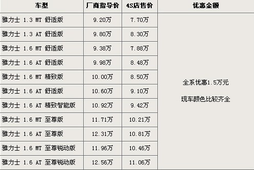 據(jù)廣汽豐田北京地區(qū)4S店銷售人員介紹,現(xiàn)在購(gòu)買雅力士車型全系優(yōu)惠現(xiàn)金1.5萬元。目前雅力士1.3排量和1.6排量均有現(xiàn)車供應(yīng),現(xiàn)車顏色以黑色、紫色、銀色為主。北京地區(qū)各4S店由于訂單不同,各店銷售的現(xiàn)車顏色有所不同。