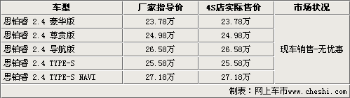 據(jù)東風(fēng)本田4S店銷售人員介紹,目前思鉑睿全系車型均以到店,但車型顏色比較單一。思鉑睿全系提供了塔夫綢白、彩晶黑、鈦金銀、炫影藍(lán)、炫動紫五種外觀顏色,以及靜雅黃、靜逸黑兩種內(nèi)飾顏色供消費(fèi)者選擇。TYPE-S車型還推出炫速紅專用色。售后保養(yǎng)方面制定整車三年十萬公里的保修政策,提供3個月/5000公里的易損件保修服務(wù)。
