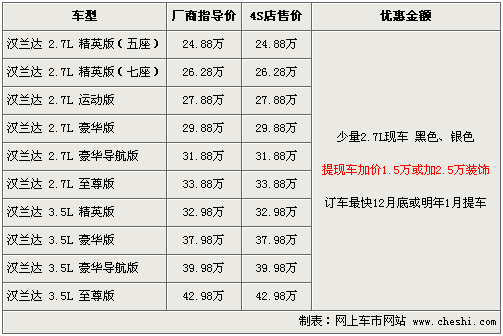 據(jù)北京地區(qū)廣州豐田4S店銷售人員介紹,目前漢蘭達(dá)除2.7豪華及頂配車型有位數(shù)不多的現(xiàn)車外,其他款均需要預(yù)訂,但正常訂車的話需要等到年底或明年1月份提車。消費(fèi)者如果提現(xiàn)車的話,需要加現(xiàn)金1.5萬(wàn)元現(xiàn)金或者加裝2.5萬(wàn)元裝飾,現(xiàn)車顏色有黑色、銀色可供選擇。北京地區(qū)各4S店由于訂單不同,各店銷售的現(xiàn)車顏色有所不同。