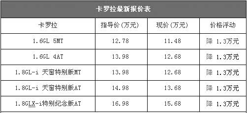 最近一段時間,卡羅拉的銷售情況一直都非常不錯,因此其價(jià)格相對來說也比較穩(wěn)定。近日,我們從北京的一些一汽豐田汽車綜合經(jīng)銷商處了解到,目前卡羅拉可優(yōu)惠1.3萬元,比9月份的價(jià)格下降了3000元,和其歷史最低價(jià)已經(jīng)非常接近。以下是卡羅拉部分車型最新報(bào)價(jià)表: