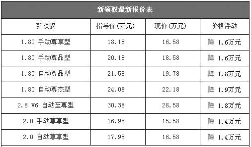 上海大眾PASSAT新領(lǐng)馭的外形大氣,在國(guó)內(nèi)公務(wù)車市場(chǎng)中銷量名列前茅,在很多國(guó)人眼中新領(lǐng)馭是公務(wù)車的首選車型。進(jìn)入10月份之后,北京地區(qū)綜合經(jīng)銷商處新領(lǐng)馭的優(yōu)惠再次增加,目前新領(lǐng)馭全系車型的降幅均在1.4-1.9萬(wàn)元區(qū)間,其中新領(lǐng)馭最低配車型的售價(jià)為15.58萬(wàn)元,比9月份下降了6000元,性價(jià)比再次提升。以下是新領(lǐng)馭全系車型最新詳細(xì)報(bào)價(jià)表: