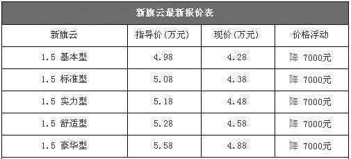 新旗云是目前國內(nèi)市場上最便宜的緊湊型新車,全系售價(jià)均在4-5萬元區(qū)間,性價(jià)比比夏利等競爭對手高出不少,非常值得入手。近日,編輯從北京地區(qū)的亞運(yùn)村汽車交易市場奇瑞汽車綜合經(jīng)銷商處了解到,近期新旗云全系可優(yōu)惠7000元,和8月底9月初的價(jià)格持平,其中新旗云最低配車型的售價(jià)為4.28萬元,僅比夏利貴了5000元左右,性價(jià)比突出。以下是新旗云最新報(bào)價(jià)表: