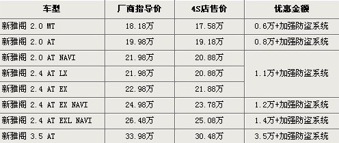 據(jù)廣州本田北京地區(qū)4S店銷售人員介紹,現(xiàn)購(gòu)買新雅閣均有6千-3.5萬不等的優(yōu)惠,最低售價(jià)17.58萬,另贈(zèng)送“車行無憂”加強(qiáng)防盜系統(tǒng),例如您的車被拖走也會(huì)第一時(shí)間知道。3.5AT頂級(jí)型目前現(xiàn)車較少,則需要預(yù)定。