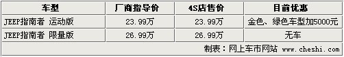 據(jù)4S店銷售人員介紹:目前09款指南者北京地區(qū)無現(xiàn)車,但經(jīng)銷商處承諾將在本月15號到一批指南者運動版車型,顏色為黑色、墨綠色及金色車型,但到車數(shù)量不會太多,基本保持在5-10臺。如需預(yù)定,需交訂金5000元,如感興趣請及時與店內(nèi)取得聯(lián)系。需要注意的是,如果購買金色及墨綠色車型,需加價5000元,由于購買此顏色消費者很多,所以采取此行為。車價方面,目前車源緊張無任何優(yōu)惠,購車也不附贈任何裝飾。