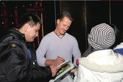 昨晚,參加世界車王爭霸賽的舒馬赫抵京,入住北辰洲際酒店,引來車迷的追捧。