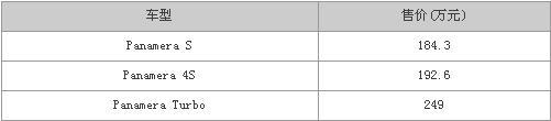 2009年11月9日,保時(shí)捷以“至善者不息”為主題,在廈門舉行了全新Panamera的發(fā)布會(huì),并且宣布新車將于11月底于全國(guó)范圍內(nèi)各家保時(shí)捷中心到店。共發(fā)布了三款車型,分別為Panamera S、Panamera 4S和Panamera Turbo,詳細(xì)車型售價(jià)請(qǐng)見(jiàn)下表: