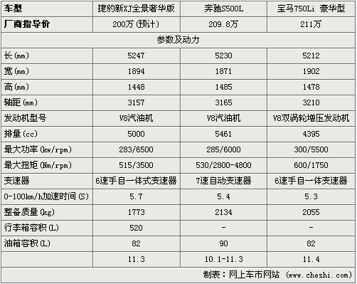 在動力上,三款車都搭載是V8汽油機,不過寶馬750Li配置的是雙渦輪增壓,因此在功率、扭矩上優(yōu)勢相當(dāng)明顯,相比來說捷豹新XJ要遜色一些,不過捷豹也有5.0L增壓發(fā)動機只是前期暫不引入。在變速器方面,捷豹新XJ和寶馬750Li都配置是6速手自一體變速器,而奔馳S500L則配置是7速變速器。在加速性能上,配置v8雙渦輪發(fā)動機750Li優(yōu)勢突出,0-100Km/h加速僅需5.3秒,不過三款車都在6秒以內(nèi),對于這樣的長軸距車型來說已經(jīng)不錯了。