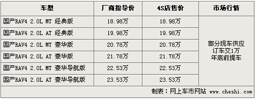 據(jù)一汽豐田北京地區(qū)4S店銷售人員介紹,目前該車有部分車型少量現(xiàn)車,由于RAV4貨源比較緊張,大部分車型及顏色消需要提前預(yù)定,訂車需要等待2個(gè)月的時(shí)間,也就是要到年底前才可以提到現(xiàn)車。如果著急購(gòu)買,需加價(jià)現(xiàn)金一萬元或在4S店購(gòu)買等值的裝飾,F(xiàn)車顏色以黑色、白色、銀色為主。北京地區(qū)各4S店由于訂單不同,各店銷售的現(xiàn)車顏色有所不同。