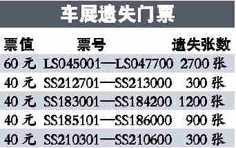 這5400張車展門票是在19日晚間遺失的,車展主辦方已經(jīng)報(bào)案。涉及面值分別有60元和40元兩種,各有2700張。