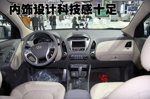 現(xiàn)代ix35的內(nèi)飾設計極具動感,黑色的中控臺只搭配了少量的銀色飾條十分醒目,而四幅式的方向盤經(jīng)過銀色飾條的裝扮,也顯得別具一格,紅色真皮座椅一般之后再運動風格濃厚的車型上才見到。