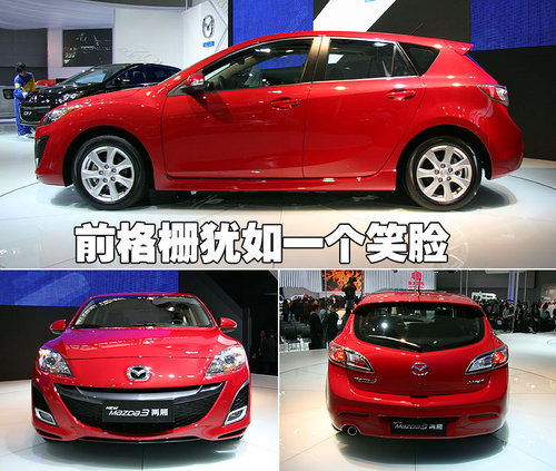 這款即將引入國內(nèi)的全新兩廂馬自達3的前臉設計,與第二代馬自達6極為相似。寬大的前進氣格柵邊緣微微上翹,猶如一個大大的笑臉。另外,這款車的前霧燈也經(jīng)過了重新設計,顯得非常運動。