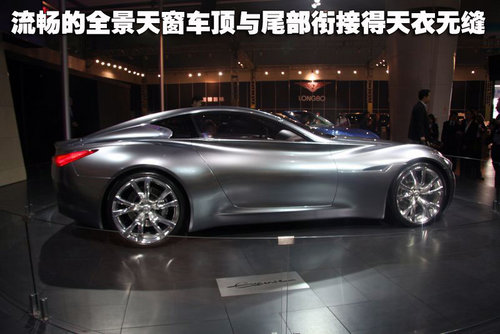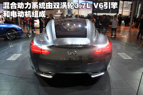 圍著這輛英菲尼迪斥巨資打造的GT跑車轉(zhuǎn)上一圈,你會驚嘆它是如此的低矮,如此的修長。環(huán)繞整個車身的腰線,華麗的曲面,將流暢的全景天窗車頂與尾部銜接得天衣無縫。 它那長得有些夸張的引擎蓋,完全是為了承載一部動力強勁到足以與法拉利Scuderia叫板的混合動力系統(tǒng)。一臺標準的3.7升V6自然吸氣汽油機,加裝了雙渦輪,最大功率躥升至324千瓦。當并聯(lián)的混合動力系統(tǒng)滿負荷工作時,Essence概念車可以獲得442千瓦的驚人動力。