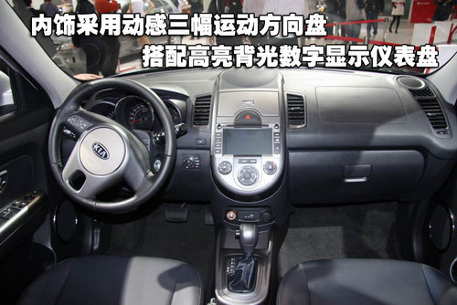 SOUL的內(nèi)飾上突出了強(qiáng)烈的未來感和科技感,三幅運(yùn)動方向盤配合高亮背光數(shù)字顯示儀表盤,中控臺溫馨的色調(diào)設(shè)計(jì)加上夜晚會發(fā)出熒光的座椅。AUX & USB接口可以接入各種多媒體載體,前門兩側(cè)的音響發(fā)光系統(tǒng)隨著音樂有節(jié)奏地律動,配上環(huán)繞全車的8聲道喇叭帶來的完美音效表現(xiàn)和集成了常用控制按鈕的方向盤,在車內(nèi)就能輕松玩轉(zhuǎn)音樂時尚。
