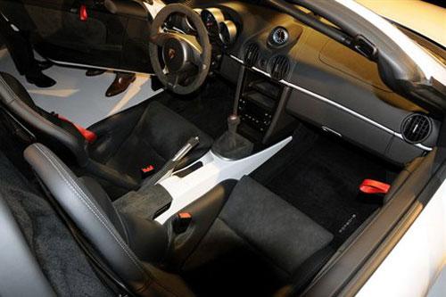 與潮流相悖,博克斯特Spyder仍堅持使用軟頂敞篷設(shè)計。為彌補少了車頂而降低的車身強度,博克斯特Spyder在A柱等部位進行了加強設(shè)計。去除了空的調(diào)系統(tǒng)與立體聲系統(tǒng),取自911 GT3 RS的鋁制車門外殼與輕量級的內(nèi)部門板則使該車維持良好的身姿:僅1275千克的體重相對博克斯特S有約80kg的減輕。降低的車身重心,全新的運動型懸掛以及一個標配的防滑差速器讓這款博克斯特Spyder擁有了可以支持其獨特外觀的出色的駕駛動力性。