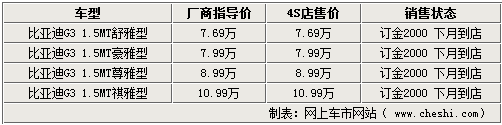 10月26日,比亞迪汽車(chē)首款中級(jí)車(chē)型G3正式在國(guó)內(nèi)上市,售價(jià)7.69-10.99萬(wàn)元。比亞迪G3是比亞迪汽車(chē)A3銷(xiāo)售網(wǎng)絡(luò)和G系產(chǎn)品的首款車(chē)型,標(biāo)志著比亞迪汽車(chē)開(kāi)啟了全新的產(chǎn)品時(shí)代,走向高端化發(fā)展路線。網(wǎng)上車(chē)市網(wǎng)站了解到,目前比亞迪各家經(jīng)銷(xiāo)商處還沒(méi)有G3現(xiàn)車(chē)銷(xiāo)售,僅提供預(yù)訂,訂金2000元,最快將在下個(gè)月到店。詳情如下: