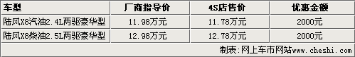 9月17日,陸風首款城市型SUV正式在江西南昌發(fā)布上市,共推出兩款車型,分別是豪華汽油版和豪華柴油版,其中汽油版售價11.98萬元,而柴油版售價12.98萬元。目前陸風X8雖然已經正式上市,但在4S店出現(xiàn)車還不全,現(xiàn)金優(yōu)惠2000元。