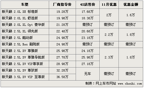 筆者了解,相比11月份的優(yōu)惠幅度,目前新天籟價(jià)格最高優(yōu)惠僅為1.8萬(wàn)元,上個(gè)月的最高優(yōu)惠則為2.3萬(wàn)元,但是現(xiàn)車供應(yīng)情況仍然比較緊張,除了標(biāo)準(zhǔn)版和舒適版有部分可選擇外,2.5升的部分車型仍需要訂購(gòu),月底將到一批新車。入門(mén)級(jí)優(yōu)惠后售價(jià)為17.68萬(wàn)。