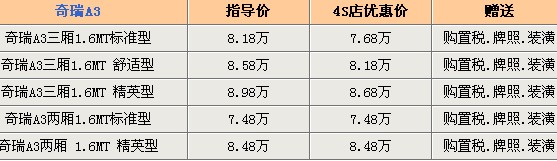 全新的2010款奇瑞A3于近日正式上市,全系均添加了ESP并在內外裝飾上有了更多的亮點。筆者從奇瑞汽車經銷商了解到,2010款A3目前現(xiàn)車很少,現(xiàn)在預訂要等到明年1月初提車,目前價格上沒有優(yōu)惠。不過店內還有部分老款庫存車型,其中三廂車型在享受最高5000元優(yōu)惠的同時還可贈送多重優(yōu)惠,包括送全額購置稅,價值3000元左右的外牌以及國產全車貼膜、倒車雷達裝潢等等,禮包實惠價值超過了8000元。