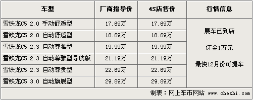 東風雪鐵龍4S店銷售人員介紹,C5目前已開始接受預訂,訂金為1萬元,目前陸續(xù)已有客戶開始訂車,最快12月份可以提到現(xiàn)車。C5的展車現(xiàn)已到店,對這款車感興趣的朋友不妨親身去體驗一下。東風雪鐵龍C5共有2.0L、2.3L和3.0L三種排量,四種級別可供選擇。