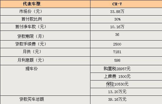 馬自達(dá)CX-7剛剛上市不久,但是關(guān)注這款車的人可是大有人在,這款車現(xiàn)在也已經(jīng)推出了各種各樣的貸款方案,編者特選擇其中代表性的一種,CX-7的貸款方案也是遵循了首付三成貸款三年,雖然三年下來(lái)說(shuō)付了幾萬(wàn)元錢,但是如果不是一次性將資金投放在這款車上就可以有充足的流動(dòng)資金以備他用。