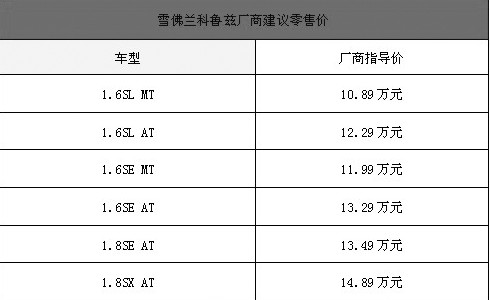 2009年4月9日,上海通用汽車公布了倍受關(guān)注的新生代性能中級(jí)車雪佛蘭科魯茲的售價(jià)。雪佛蘭科魯茲此次共有1.6L和1.8L兩款排量六種不同配置的車型,配備五速手動(dòng)和S6六速手自一體變速箱,并有六種車身顏色可供選擇,最終價(jià)格區(qū)間定為10.89-14.89萬元。即日起全國各地的雪佛蘭經(jīng)銷商店開始接受預(yù)訂。