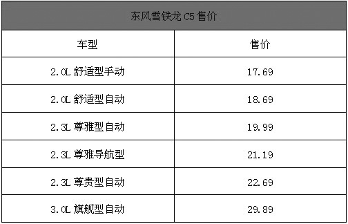 2009年11月23日,在第七屆中國(guó)國(guó)際汽車(chē)博覽會(huì)上,備受矚目的09年B級(jí)車(chē)市壓軸之作,東風(fēng)雪鐵龍品牌戰(zhàn)略旗艦車(chē)型C5正式公布價(jià)格。東風(fēng)雪鐵龍C5共有2.0L、2.3L和3.0L三種排量,四種級(jí)別可供選擇,其價(jià)格區(qū)間為17.69萬(wàn)-29.89萬(wàn)元。從即日起,全國(guó)各指定銷(xiāo)售網(wǎng)點(diǎn)開(kāi)始接受預(yù)訂,首批展車(chē)也將陸續(xù)到店,并于2010年1月初正式交付。