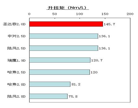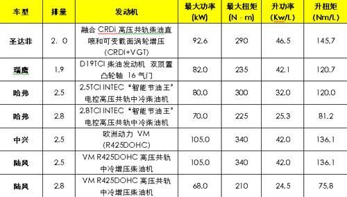 通過發(fā)動(dòng)機(jī)的對比(上表),我們不難發(fā)現(xiàn),在發(fā)動(dòng)機(jī)的功率和扭矩方面中興和陸風(fēng)略勝一籌,然而在真正反映發(fā)動(dòng)機(jī)動(dòng)力技術(shù)水平的指標(biāo)——升功率上,排量較小的圣達(dá)菲2.0T則領(lǐng)先排名第二的瑞鷹10.5。