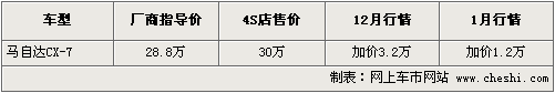 據(jù)一汽馬自達(dá)4S店銷(xiāo)售人員介紹:CX-7自上市起一直加價(jià)3.2萬(wàn)元,近期該車(chē)型加價(jià)所有降低,提現(xiàn)車(chē)需加價(jià)1.2萬(wàn)元,日前店內(nèi)有黑色及銀色現(xiàn)車(chē)供應(yīng),購(gòu)車(chē)可贈(zèng)送貼膜、倒車(chē)?yán)走_(dá)等裝飾。如消費(fèi)者有意購(gòu)買(mǎi),到店詳談會(huì)有更優(yōu)惠的價(jià)格。北京地區(qū)各4S店由于訂單不同,各店銷(xiāo)售的現(xiàn)車(chē)顏色有所不同。