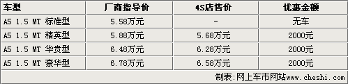 據(jù)奇瑞汽車4S店銷售人員介紹,目前奇瑞A5標(biāo)準(zhǔn)型由于配置太低,4S店內(nèi)無(wú)車銷售,其他三款車型現(xiàn)車都比較齊全,F(xiàn)在A5的優(yōu)惠幅度比元旦前要少,只能優(yōu)惠2000元,而且不能贈(zèng)送裝飾。
