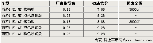 據(jù)長(zhǎng)安鈴木4S店銷(xiāo)售人員介紹,雨燕目前現(xiàn)車(chē)并不多,炫銳版手動(dòng)擋和自動(dòng)擋兩款車(chē)型目前只能優(yōu)惠3000元。以外,還有手動(dòng)雙色炫銳版,目前只有極少現(xiàn)車(chē),并且沒(méi)有任何優(yōu)惠。而自動(dòng)雙色炫銳版和粉色炫銳版目前都沒(méi)有現(xiàn)車(chē),預(yù)訂需要等15天左右。