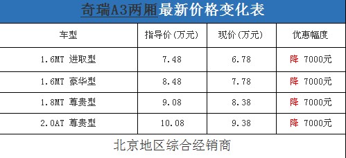 近日,編輯從北京地區(qū)綜合經(jīng)銷商處了解到,奇瑞A3的現(xiàn)車充足,顏色也比較齊全,提供給消費(fèi)者的選擇空間較大;目前購(gòu)買該車全系都可以優(yōu)惠7000元現(xiàn)金,與之前的降價(jià)幅度相比有了小幅度的提升,性價(jià)比很不錯(cuò)。據(jù)經(jīng)銷商透露,消費(fèi)者要想以這個(gè)價(jià)格購(gòu)車,需要在店內(nèi)做一條龍服務(wù),其中車輛四項(xiàng)基本險(xiǎn)最低可以打7折(約合2500-3000元左右)。以下是奇瑞A3最新價(jià)格變化表: