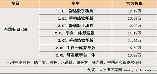 1月25日,東風(fēng)標(biāo)致408在北京全球首發(fā)上市,這是標(biāo)致汽車品牌創(chuàng)立120年以來,首次在海外市場全球首發(fā)其最新一代車型,同時公布了全系車型的售價。此次上市的東風(fēng)標(biāo)致408系列共有7款車型,分為舒適版、豪華版、尊貴版三種配置版本,以配備CVTS-II技術(shù)的2.0L發(fā)動機為主打產(chǎn)品,其價格從12.99萬元至16.99萬元;同時408系列中也包含1.6L發(fā)動機系列,其手動舒適版入門售價為12.19萬元,主打車型2.0L舒適版手自一體版售價為14.19萬元。7款車型的售價如下表: