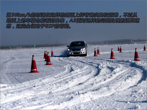 在雪地上行駛,過(guò)于光滑的路面是最大的安全隱患,幾乎為零的摩擦力使得四個(gè)輪子幾乎抓不住地面。在專(zhuān)業(yè)教練的陪同下,我們首先在開(kāi)啟ESP功能的情況下的行駛中躲避障礙物的體驗(yàn)。以預(yù)定車(chē)速進(jìn)入車(chē)道后將車(chē)輛加速至50-60km/h,向左躲避面前的一個(gè)裝桶,第一個(gè)緊急變線(xiàn)時(shí),(將方向盤(pán)的向左的轉(zhuǎn)向角度故意打的比常態(tài)更大一些,目的是為了讓車(chē)底的轉(zhuǎn)向傳感器有更明顯的認(rèn)知,從而引導(dǎo)ESP更好的工作。)在車(chē)內(nèi)可以比較明顯的感覺(jué)到ESP為了糾正車(chē)輛即將出現(xiàn)的轉(zhuǎn)向不足的問(wèn)題給車(chē)輛的左后輪施加了制動(dòng)力,從而使車(chē)輛比較順利的換到了旁邊的車(chē)道內(nèi)。在這之后趕緊回正方向,ESP為了糾正車(chē)輛有可能出現(xiàn)的轉(zhuǎn)向過(guò)度的問(wèn)題又給左前輪施加了制動(dòng)力,從而使得車(chē)輛平穩(wěn)的留在了障礙物左側(cè)的車(chē)道內(nèi)。
