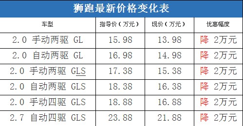 近日,編輯從北京地區(qū)綜合經(jīng)銷商處了解到,獅跑全系的現(xiàn)車充足,基本上可以滿足消費(fèi)者在春節(jié)期間的需求;目前購車全系可以優(yōu)惠2萬元現(xiàn)金,性價(jià)比很不錯(cuò)。據(jù)經(jīng)銷商透露,消費(fèi)者要想以這個(gè)價(jià)格提車,需要在店內(nèi)做購車一條龍服務(wù),其中車輛四項(xiàng)基本保險(xiǎn)可以打8.5折(約合4500-6300元左右)。以下是獅跑最新價(jià)格變化表: