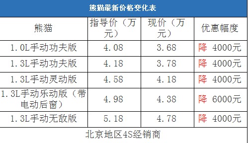 近日,編輯從北京地區(qū)吉利4S經(jīng)銷商處了解到,熊貓有少量現(xiàn)車在店內(nèi)銷售,全系可以優(yōu)惠4000元現(xiàn)金,并贈送腳墊、貼膜等基本裝飾。其中店內(nèi)有一臺1.3L手動樂動版特價車(紅色),因為是09年生產(chǎn)的,可以優(yōu)惠6000元現(xiàn)金,性價比還不錯,消費者可以到店詳談爭取更多優(yōu)惠。以下是熊貓最新價格變化表: