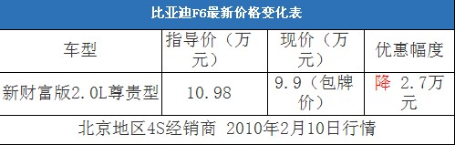 近日,編輯從北京地區(qū)比亞迪4S經(jīng)銷商處了解到,近期比亞迪F6有2.0L尊貴版現(xiàn)車(黑色、銀色)。目前這款車在店內(nèi)正在組織消費(fèi)者團(tuán)購(gòu)活動(dòng),車輛全款(包括購(gòu)車一條龍和購(gòu)置稅、上牌)為9.9萬(wàn)元,并且贈(zèng)送價(jià)值1000元的汽車裝飾,相當(dāng)于優(yōu)惠了2.7萬(wàn)元左右。以下是比亞迪F6最新價(jià)格變化表: