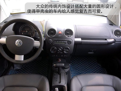 甲殼蟲的內飾具有很明顯的大眾特征,各種開關、按鍵對于經常駕駛大眾車輛的人來說是十分熟悉的。最特別的就是圓桶形的大儀表,速度表最大,幾乎占據了整個儀表盤面,中部是行車電腦,置于下方的是油表和轉速表。