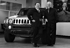 2009年10月8日,在美國密歇根州紹斯菲爾德,悍馬公司首席執(zhí)行官金泰勒(右)和四川騰中重工機(jī)械有限公司總經(jīng)理楊毅在一輛悍馬汽車前合影。