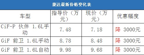 近日,編輯從北京地區(qū)一汽-大眾4S經(jīng)銷商處了解到,捷達全系有少量現(xiàn)車在售,目前店內(nèi)購車可以優(yōu)惠3000元,并且贈送價值1400元的裝潢禮包(地膠、腳墊和車撣等)。以下是捷達最新價格變化表: