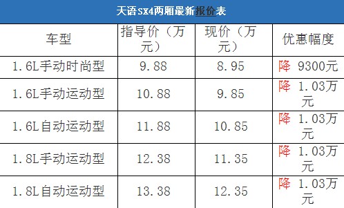 近日,編輯從北京地區(qū)長(zhǎng)安鈴木4S經(jīng)銷(xiāo)商處了解到,天語(yǔ)SX4的1.6L排量車(chē)型現(xiàn)車(chē)充足,顏色也非常齊全,目前購(gòu)車(chē)最高有1.03萬(wàn)元的現(xiàn)金優(yōu)惠,性價(jià)比很不錯(cuò)。以下是天語(yǔ)SX4最新價(jià)格變化表: