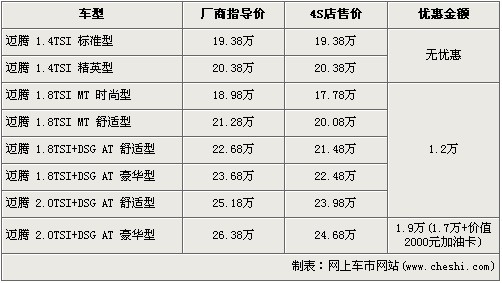 據(jù)北京一汽大眾經(jīng)銷店銷售人員介紹,邁騰全系最高配的2.0TSI自動(dòng)豪華版灰色車型近期出現(xiàn)了總價(jià)值1.9萬(wàn)元的優(yōu)惠,其中包括了1.7萬(wàn)元的現(xiàn)金優(yōu)惠,并且贈(zèng)送價(jià)值2000元的加油卡。銷售人員還介紹,邁騰新上市的1.4TSI車型停止了前段時(shí)間的加價(jià),店內(nèi)有現(xiàn)車,1.8TSI車型優(yōu)惠1.2萬(wàn)元。